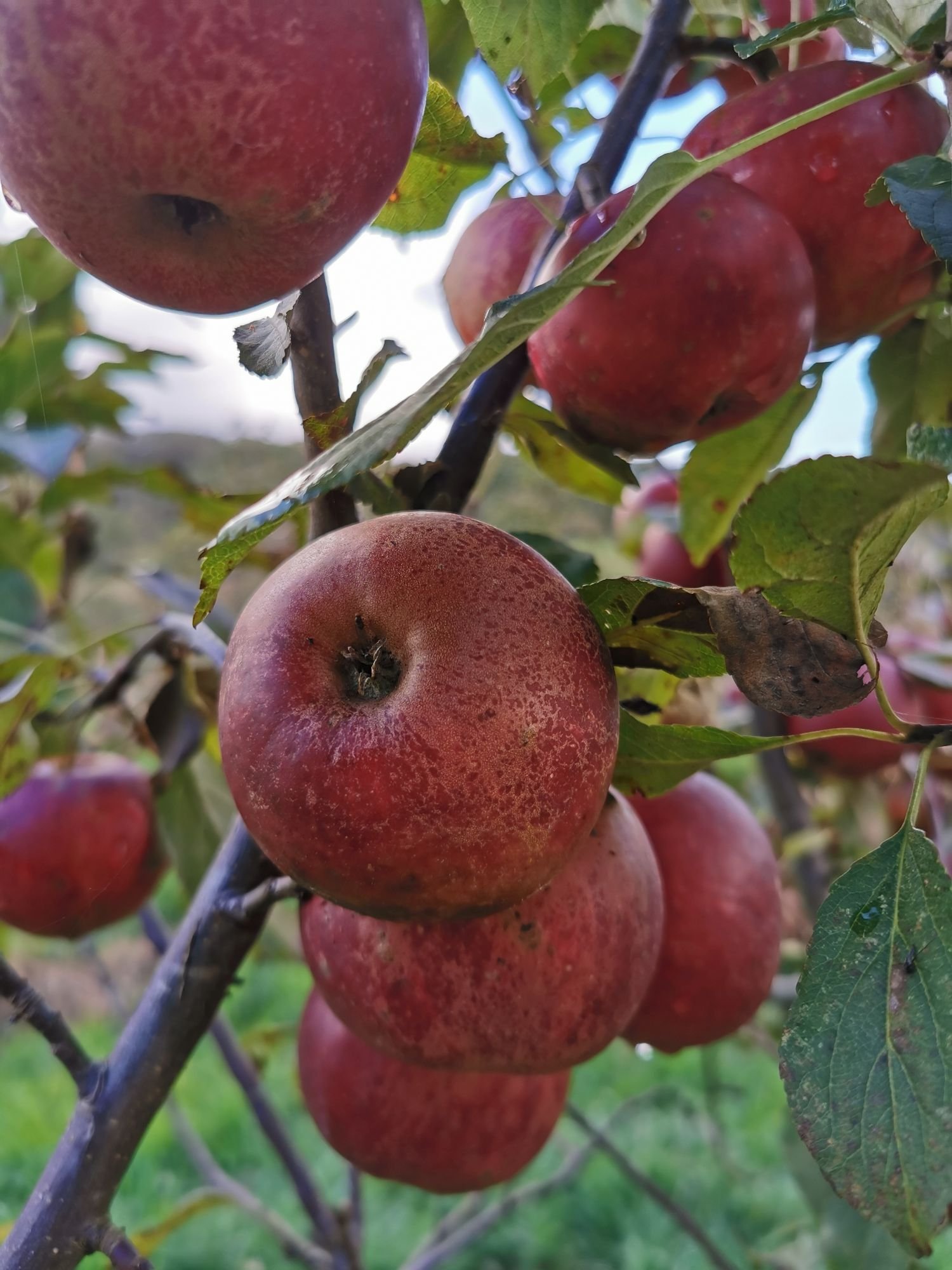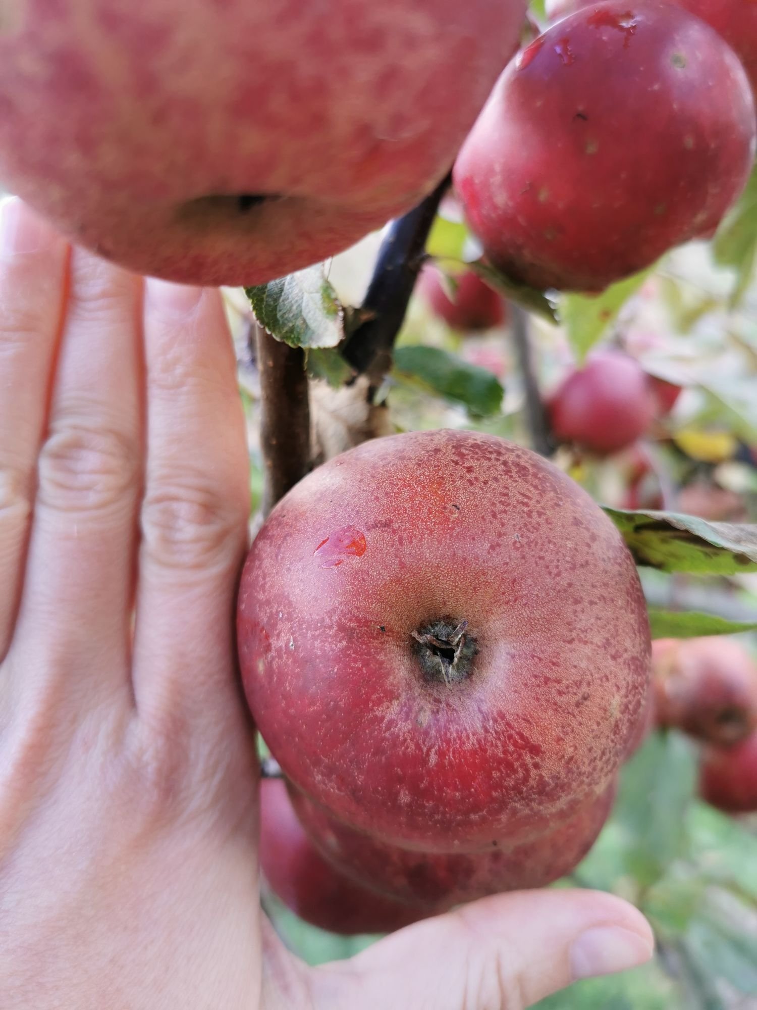 - Frugt: Mellemstore/store røde æbler med sprød konsistens og afbalanceret sødme/syrlighed. Modner i oktober og kan gemmes længe.