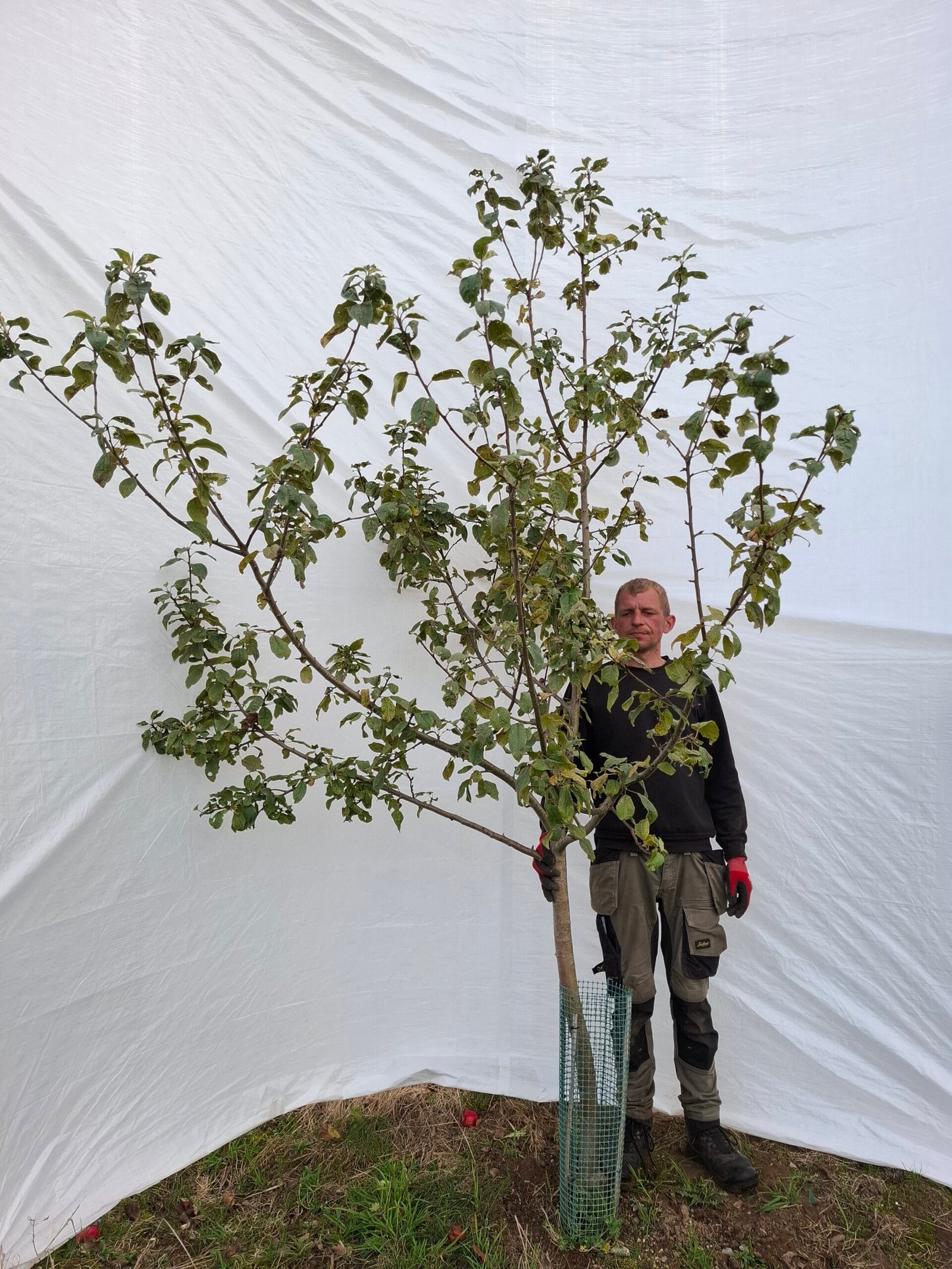Træerne giver allerede masser af æbler og står med brede, harmoniske kroner. De er dyrket på friland ved Vejle med god plads og står i 50 liters root control bags, hvilket sikrer et stærkt og sundt rodnet, der er altafgørende for træets sundhed og gør dem robuste og nemme at etablere.