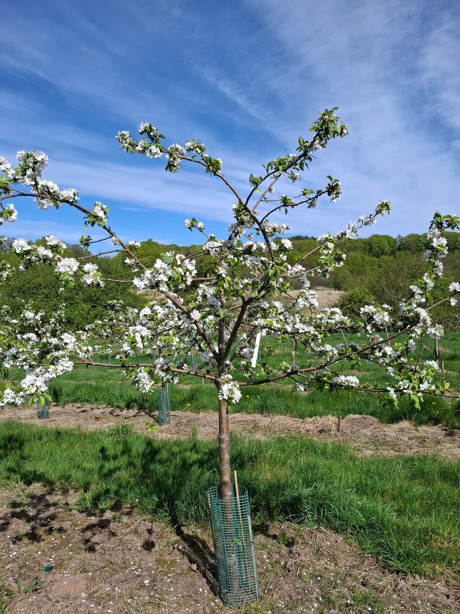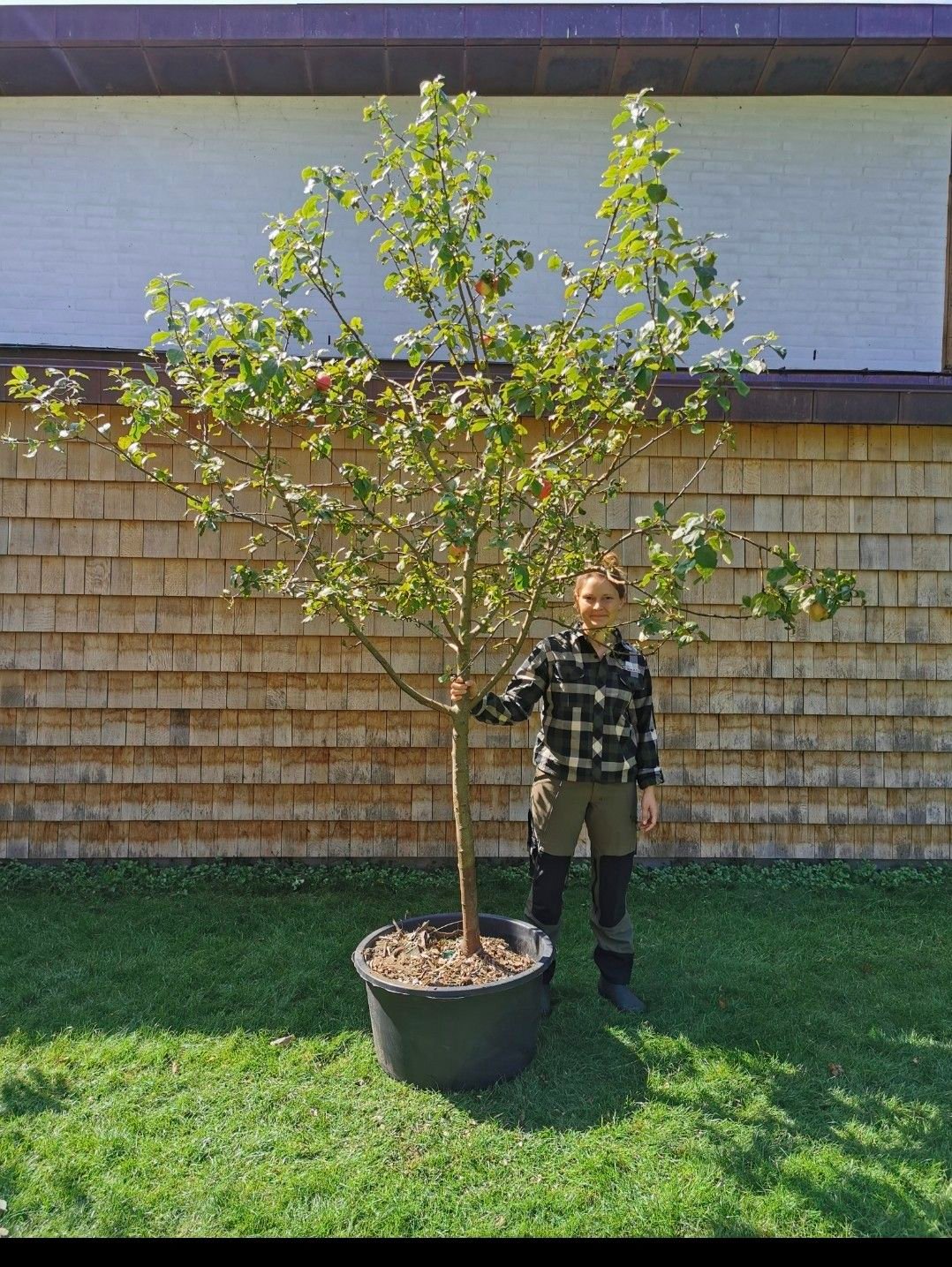Træerne giver allerede masser af æbler og står med brede, harmoniske kroner. De er dyrket på friland ved Vejle med god plads og står i 50 liters root control bags, hvilket sikrer et stærkt og sundt rodnet, der er altafgørende for træets sundhed og gør dem robuste og nemme at etablere.