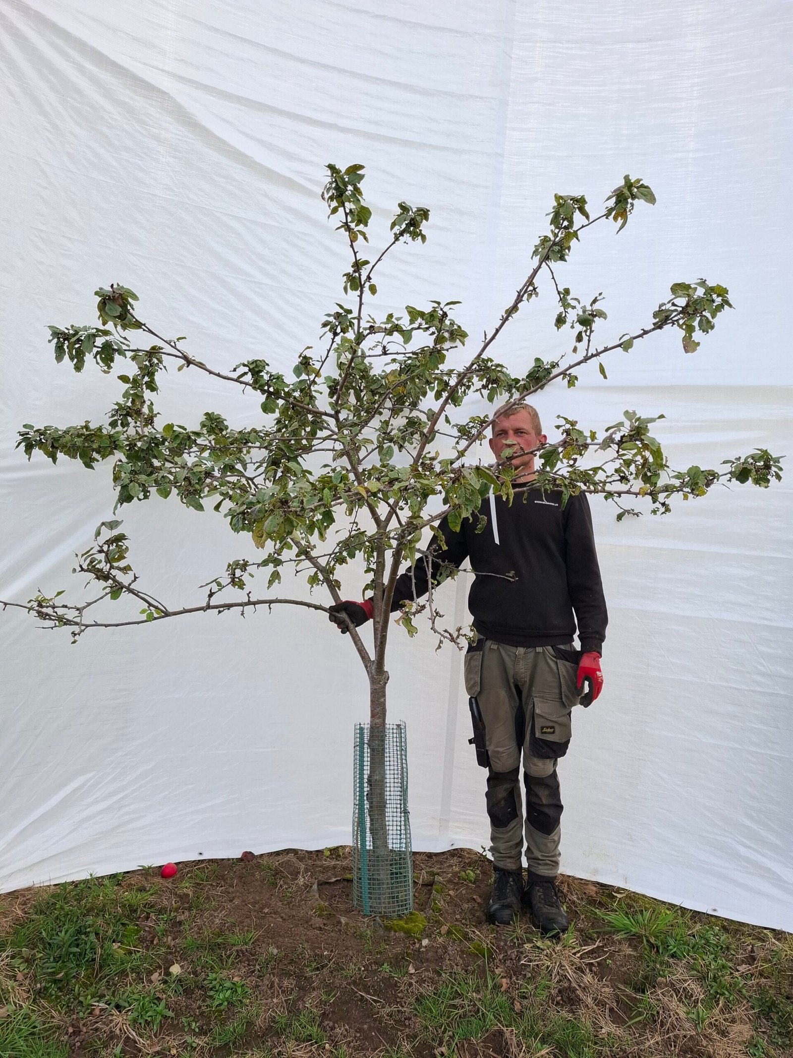 Træerne giver allerede masser af æbler og står med smukke, velproportionerede kroner. De er dyrket på friland ved Vejle med god plads og står i 50 liters root control bags, som sikrer et stærkt og sundt rodnet – altafgørende for træets vækst og etablering.