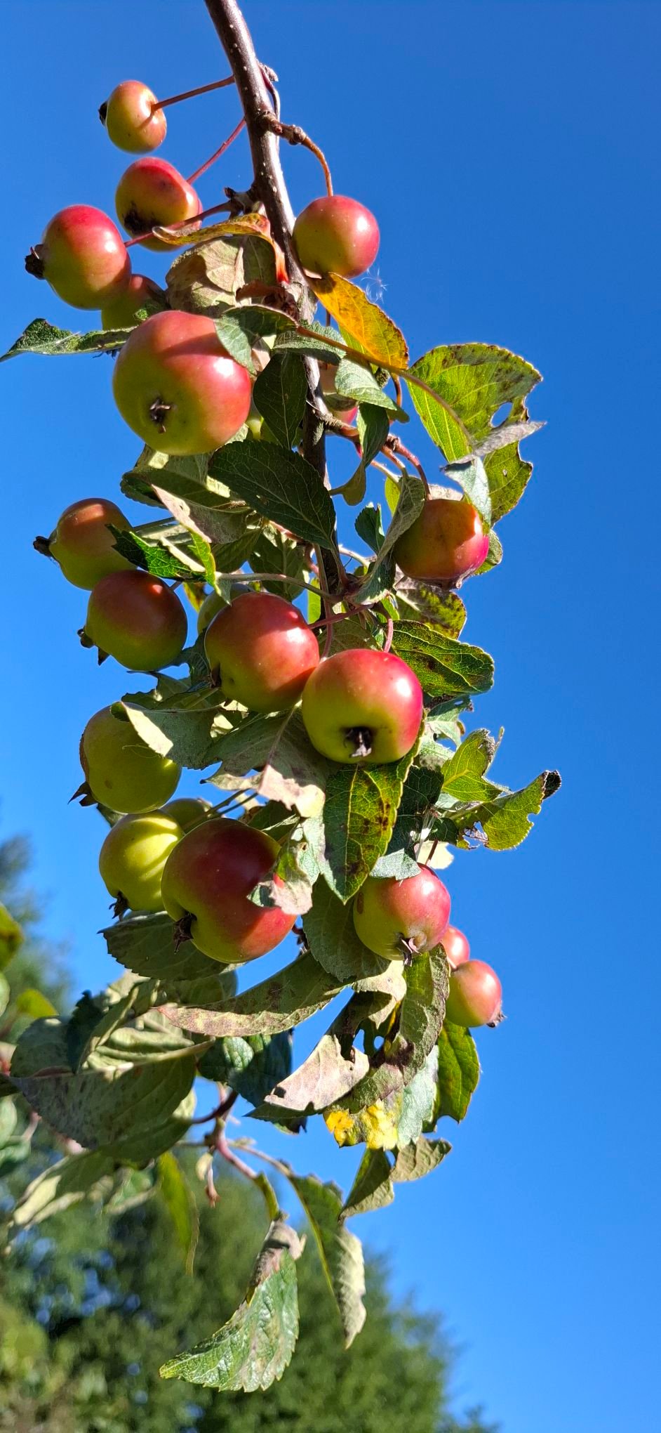 Frugt: Små orange-røde paradisæbler (aug–sep), dekorative, gode til dekoration og gelé
